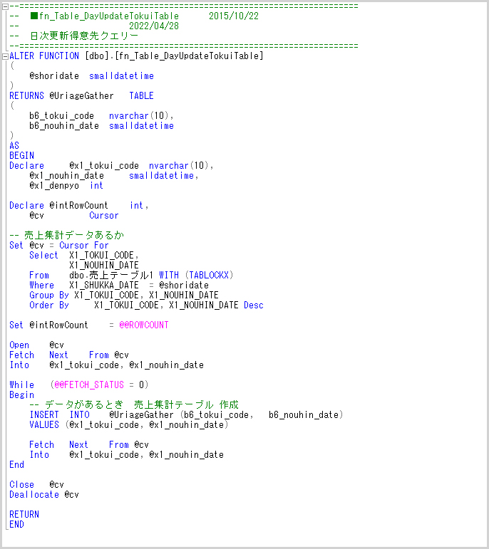 1)テーブル値関数のfn_Table_DayUpdateTokuiTableで出荷日としていた個所を納品日に変更した。