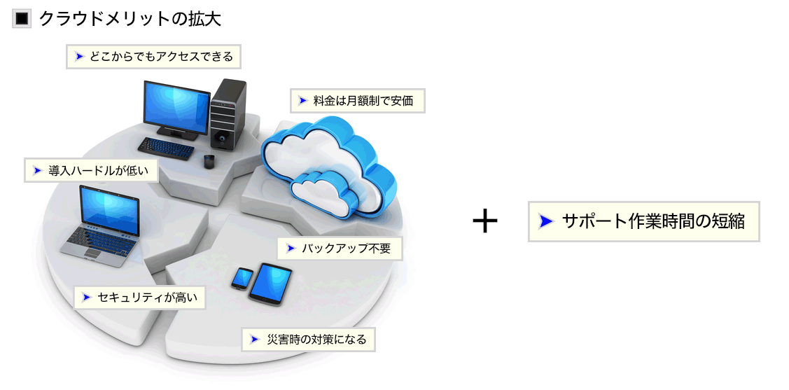 「菓子メーカーくん」クラウド版は2016年4月からマイクロソフト Azureクラウドを採用しています。現時点は2022年12月ですので6年8ヶ月経過しました。 クラウドを使用してみて分かったことは、サポート作業が短時間で終了し、エンドユーザーを煩わすことが少ないということでした。 クラウドを使用したトラブル発生時のサポート作業は、エンドユーザーを経由することなく、直接クラウド内部にアクセスして作業することが可能なので、短時間で解決します。 このことは、エンドユーザー側もサポート側もメリットがあります。