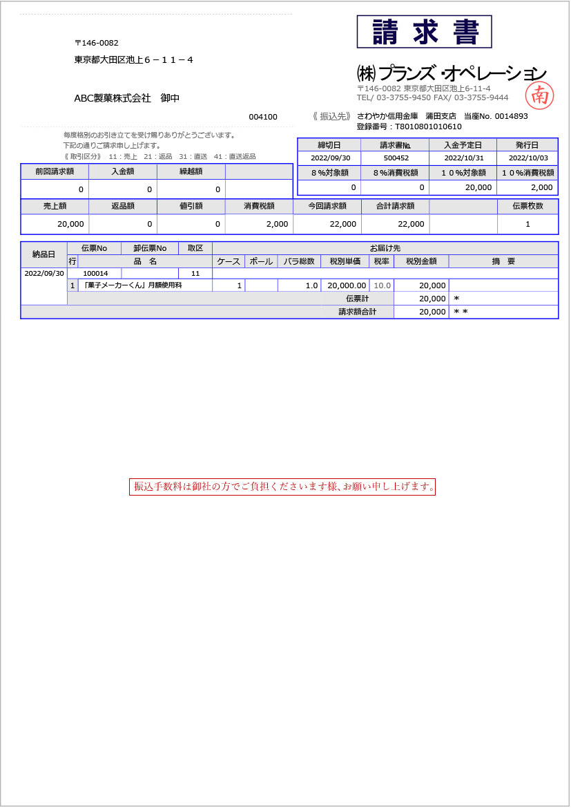 実際の請求書印刷で、振込先2に入力した登録番号が振込先の下に印字されているのが確認できます。これで適格請求書の完成です。